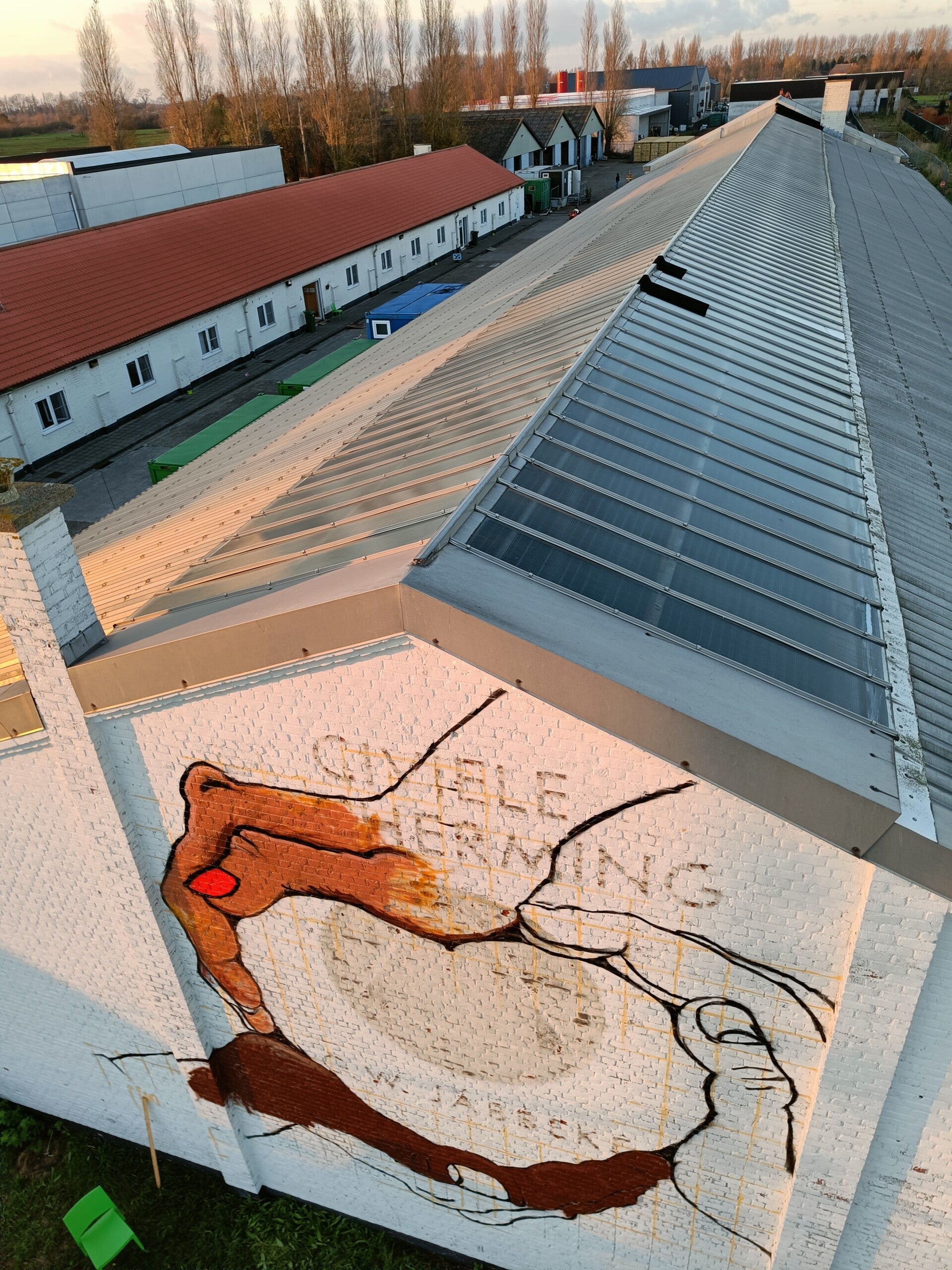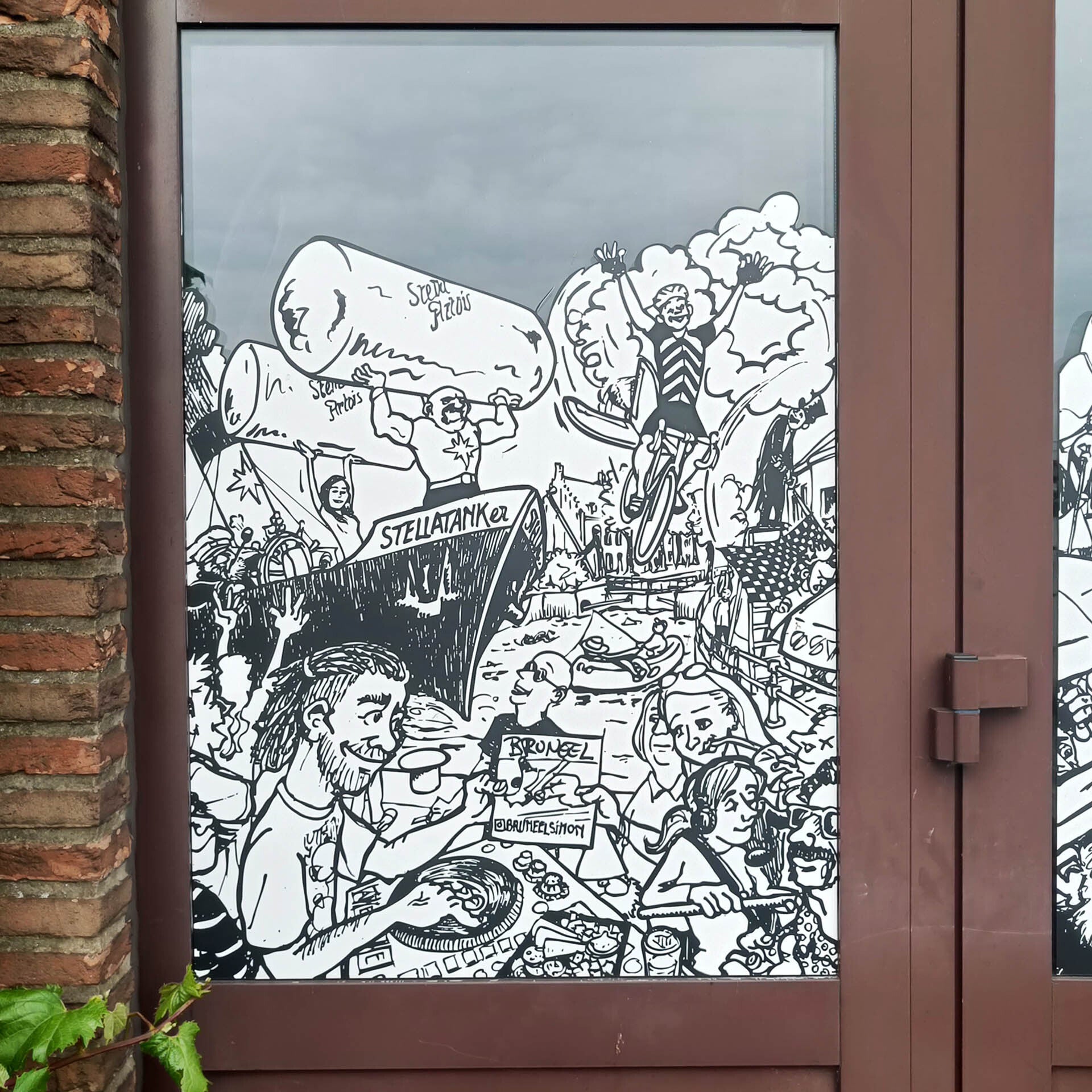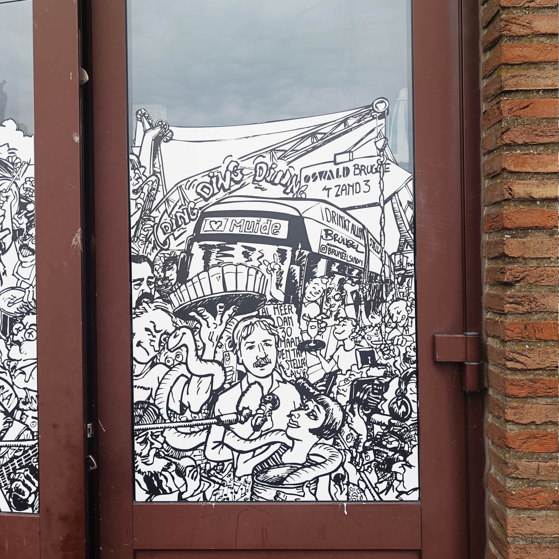 Bestickering ramen, privacy voor de werknemers met een ode aan de Muide, tankbier, de tram, feest.